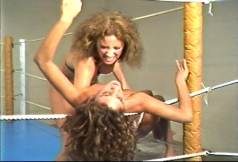 This match shows newcomer Mindy in a jet black bikini battling tiny Jill in a blue and white striped outfit. Mindy totally dominates the smaller girl and soon both sets of magnificent breasts are exposed to the talons of their opponents. A surprise ending is in store for this one.