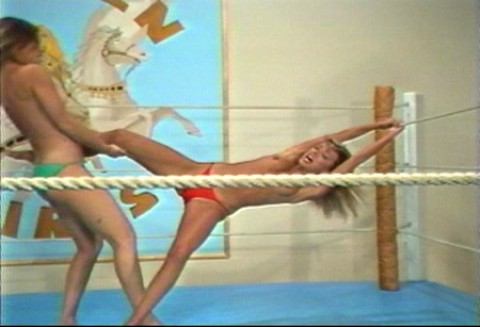 Blue bikinied Leslie slams and shakes svelte Nancy who starts out in a brief red two piece outfit. This match is a rematch of their wild catfight in GGC-39, and the action is even tougher. These two veterans of films and Southern California mud pits want to kill each other.